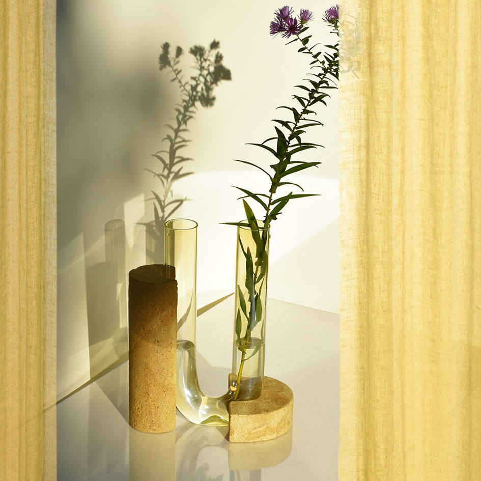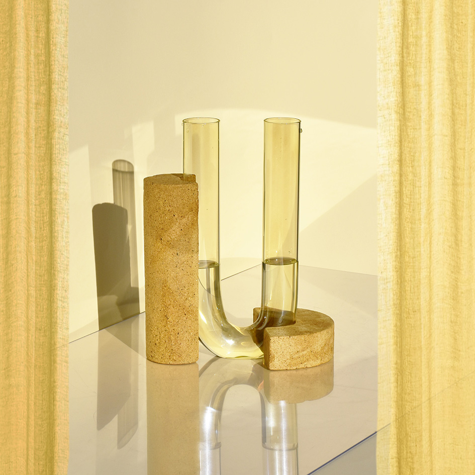 The vase consists of three separate pieces that are not permanently connected. Each piece of glass is handmade and possesses unique characteristics. The stone features an irregular surface with holes, gouges, and jagged edges, giving it a distinctive, organic appearance. Over time, the stone will lighten slightly as it absorbs the natural surface treatment, becoming brighter and more vibrant.
